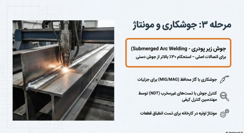- جوش زیر پودری (Submerged Arc Welding) برای اتصالات اصلی – استحکام ۳۰٪ بالاتر از جوش دستی